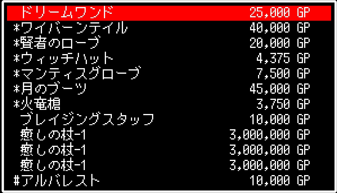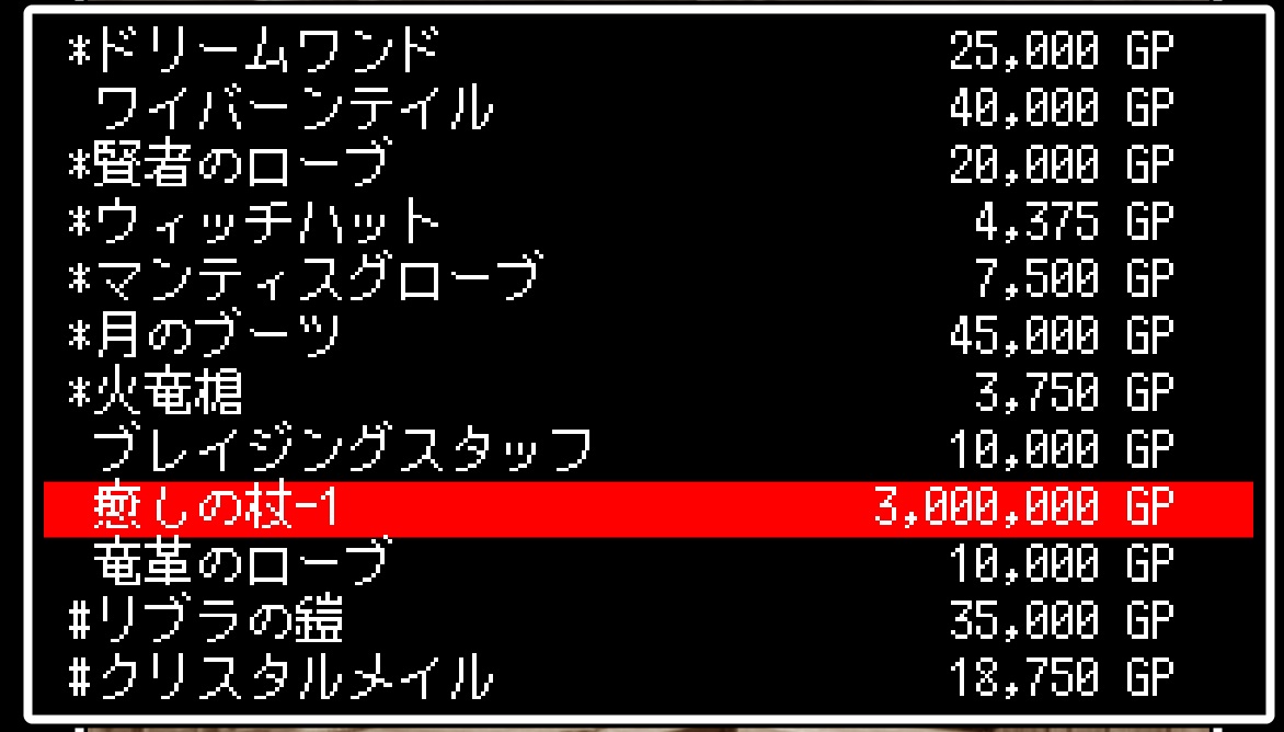 探索中に、癒しの杖を使い破損状態(-1表記)のまま町に帰還し、戦利品を商店で処分しようとしたところ、破損した癒しの杖が「つえ?」にならず破損品のまま売る事が出来る状態になってました。売値が何と300万G!!
